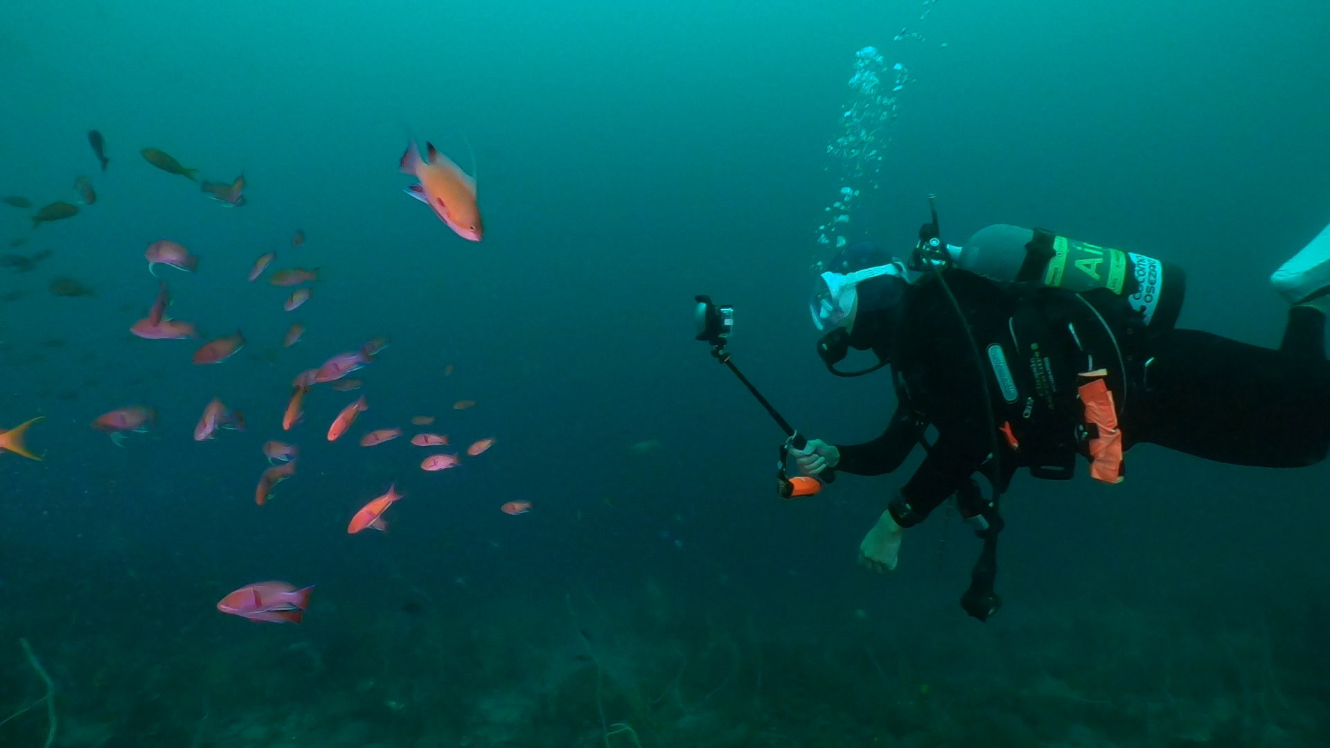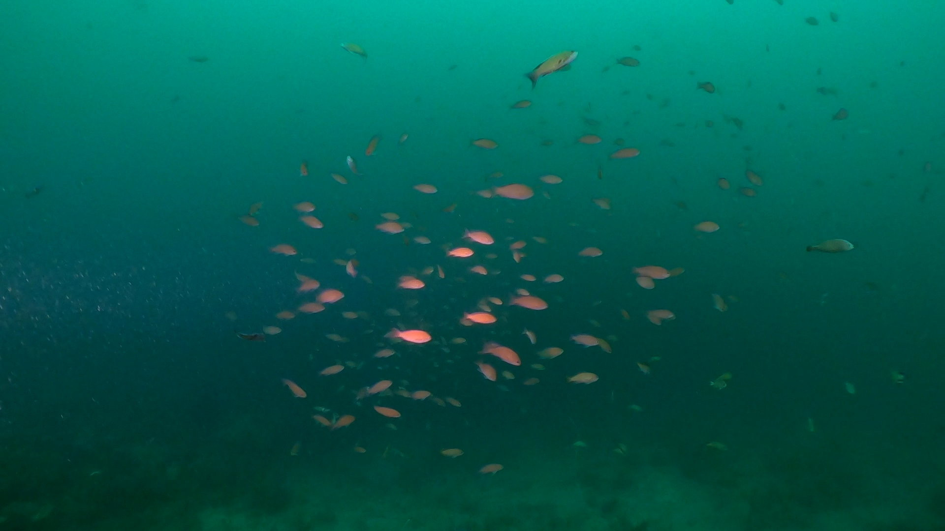 定番のキンギョハナダイやアカオビハナダイが群れており
